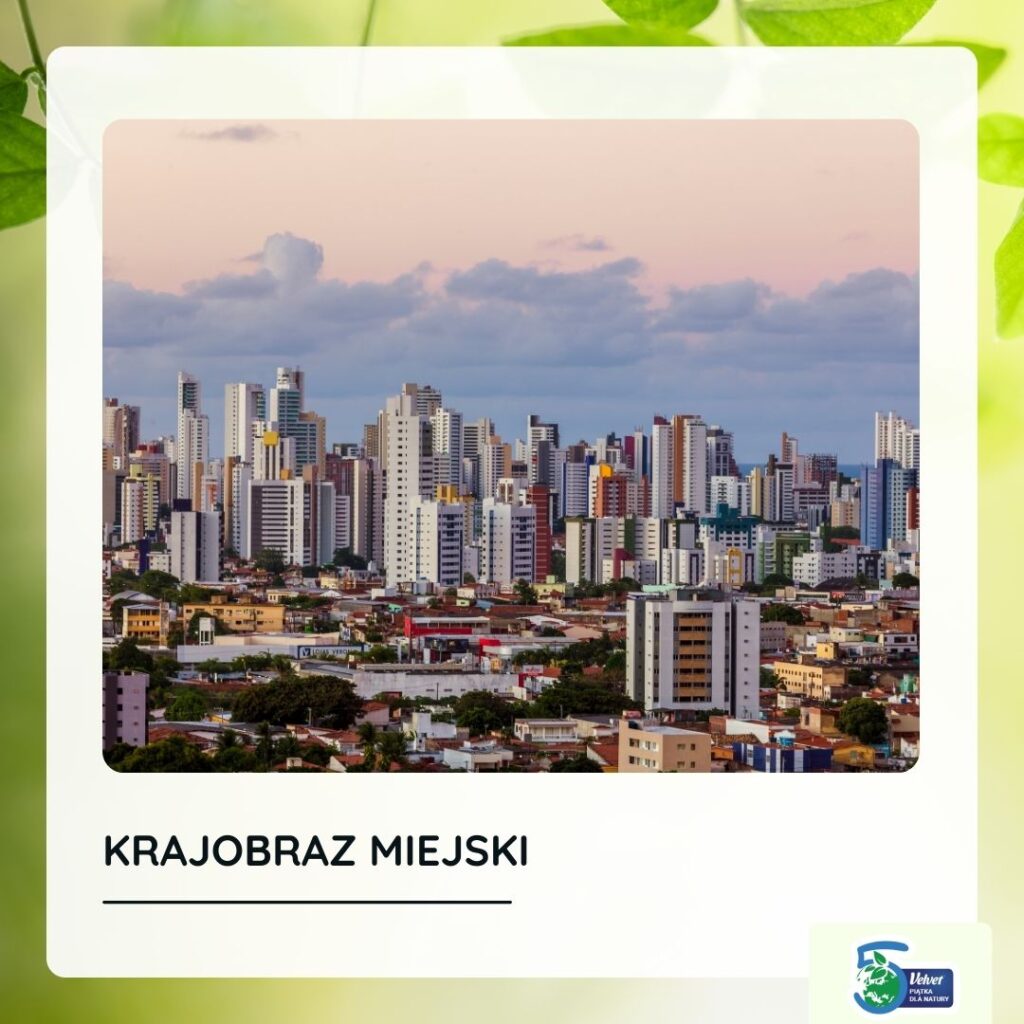 - Kontrast z przyrodą – w przeciwieństwie do krajobrazów naturalnych, w miastach elementy przyrodnicze są często w formie parków i zieleni miejskiej,